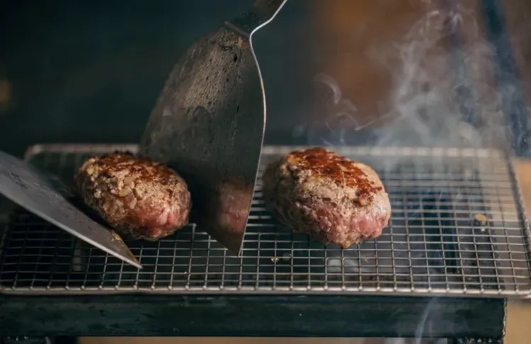 復興空廚旗下的「肉旨房」,以高溫鐵板取代炭爐鎖住漢堡排肉汁並在每個座位前方設置小炭槽,師傅先將肉品在300度的高溫鐵板上煎至兩面焦黃5-7分熟後,放置到客人的專屬烤網前,每個人可依自己喜歡的熟度加工,除了讓漢堡排更添炭香,也多了互動趣味。不論是牛、豬、雞漢堡排,都以純肉製成,手工摔打出黏性,不添加澱粉或其他配料,僅以海鹽和洋蔥調味。建議先嚐原味再搭配特製醃菜、高麗菜絲、醬汁等一起享用,每口都有不同變化。