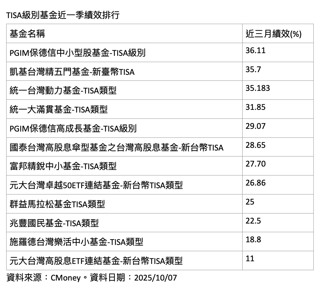 集保結算所統計,今年6月底TISA上線迄今短短3個多月,已有超過4萬人參與,目前累積有18家投信公司發行30檔TISA級別基金。首批於7月初發行的12檔TISA級別基金,累積報酬介於11%~36%之間,其中表現居前的4檔報酬甚至衝破三成,分別為:PGIM保德信中小型股基金-TISA級別、凱基台灣精五門基金-新臺幣TISA、統一台灣動力基金-TISA類型、統一大滿貫基金-TISA類型。