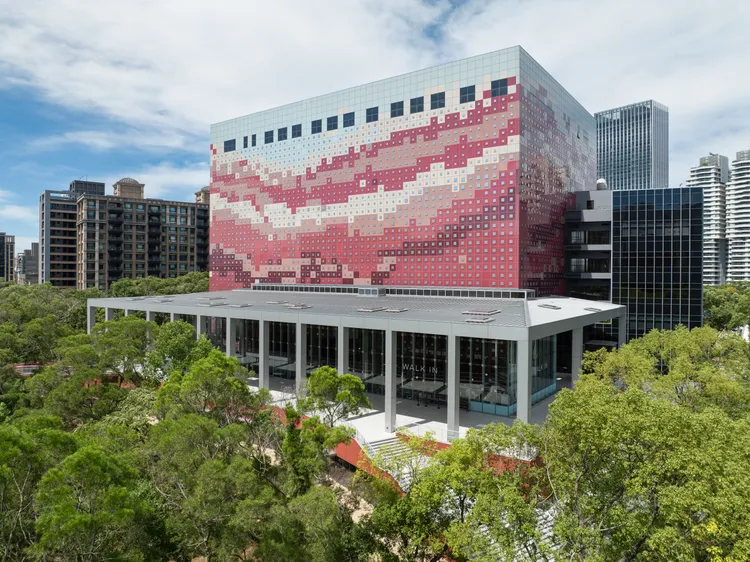 除了展廳人潮絡繹不絕,國家檔案館的建築景觀及公共藝術,更成為民眾熱門打卡點。林秋燕表示,國家檔案館選址林口,紅色漸層烤漆玻璃帷幕除了代表林口台地紅土沉積,也象徵檔案堆疊保存珍貴的國家記憶;建物僅占基地1/4面積,保留3/4自然演替次生林,結合鄰近林口運動公園形成都市綠帶,創造自然與人文共生景緻。