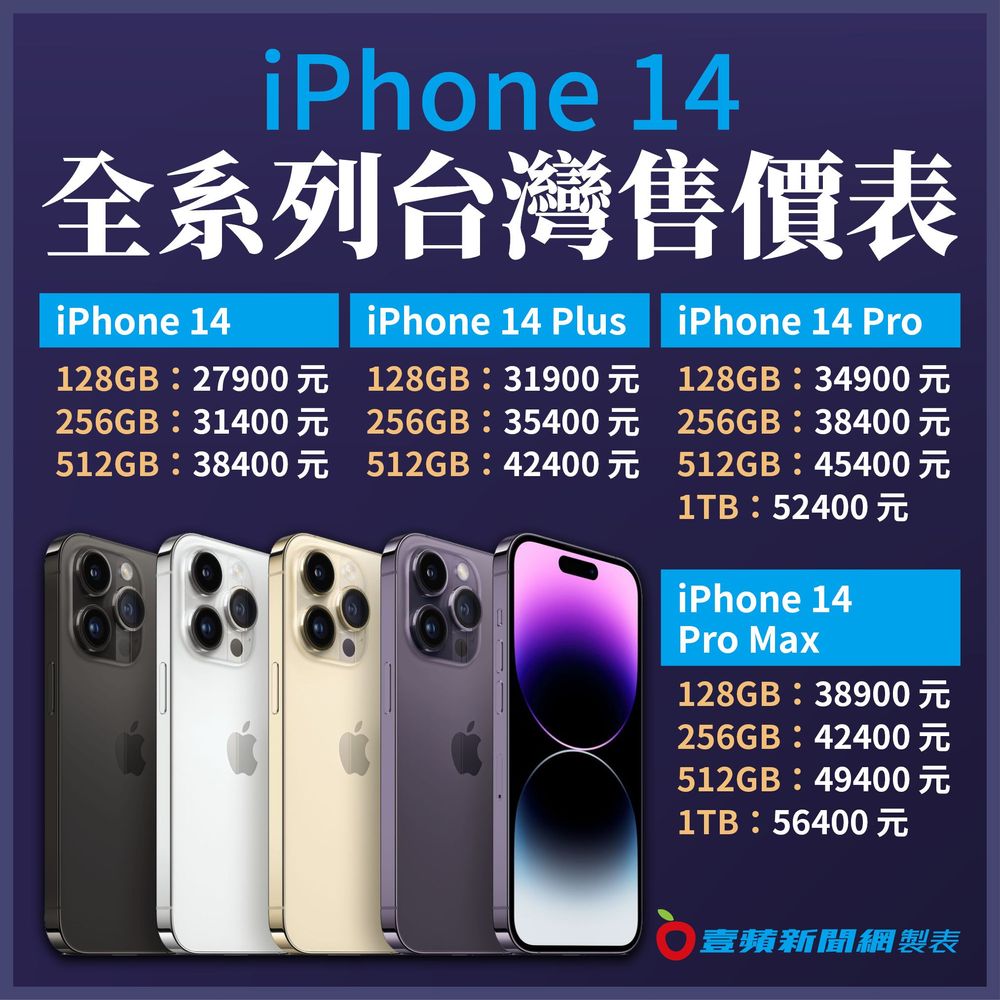 台灣官網售價顯示,各機型最低規格為128GB, iPhone 14為27900元,而iPhone 14 Plus 31900元,iPhone 14 Pro 34900 元,iPhone 14 Pro Max 38900元。對比同規格的 iPhone 13 與 iPhone 13 mini 售價 25900、 22900 元,iPhone 13 Pro 、 iPhone 13 Pro Max 售價 32900 與 36900 元,全都上漲2000元。