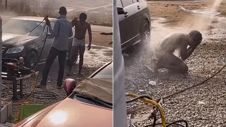 國外網友Thatblackbwoy日前在IG分享這段影片,當時賓士駕駛到洗車場後,員工便拿起高壓水槍開始洗車,想不到僅穿著內褲就下車的駕駛,表示要洗的其實是他自己,員工照辦拿高壓水槍朝他身上噴灑,駕駛則跪地享受這場特殊的淋浴。