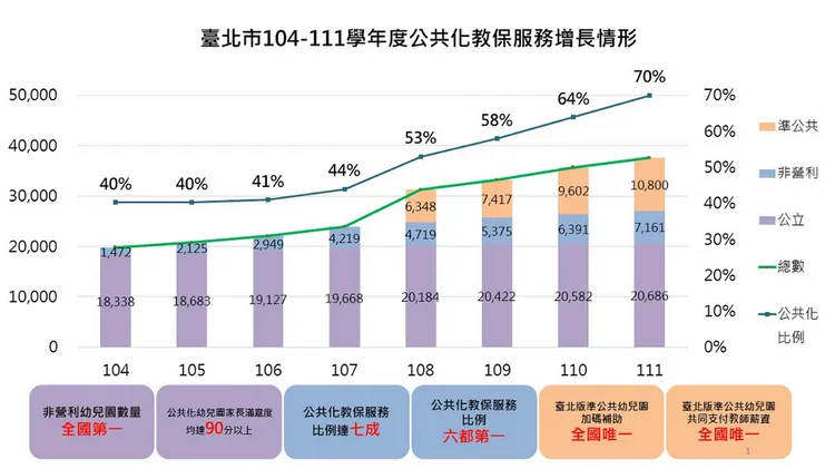 2022年7月率全國之先發布「臺北市學前教育白皮書」,以「平權共融、創新永續」為目標,透過「高比例公共教保、高功能園舍空間、高質量師資人力、高創新課程教學、高支持親職教養、高效能督導發展」等六大主軸策略,打造高品質的學前教育。
