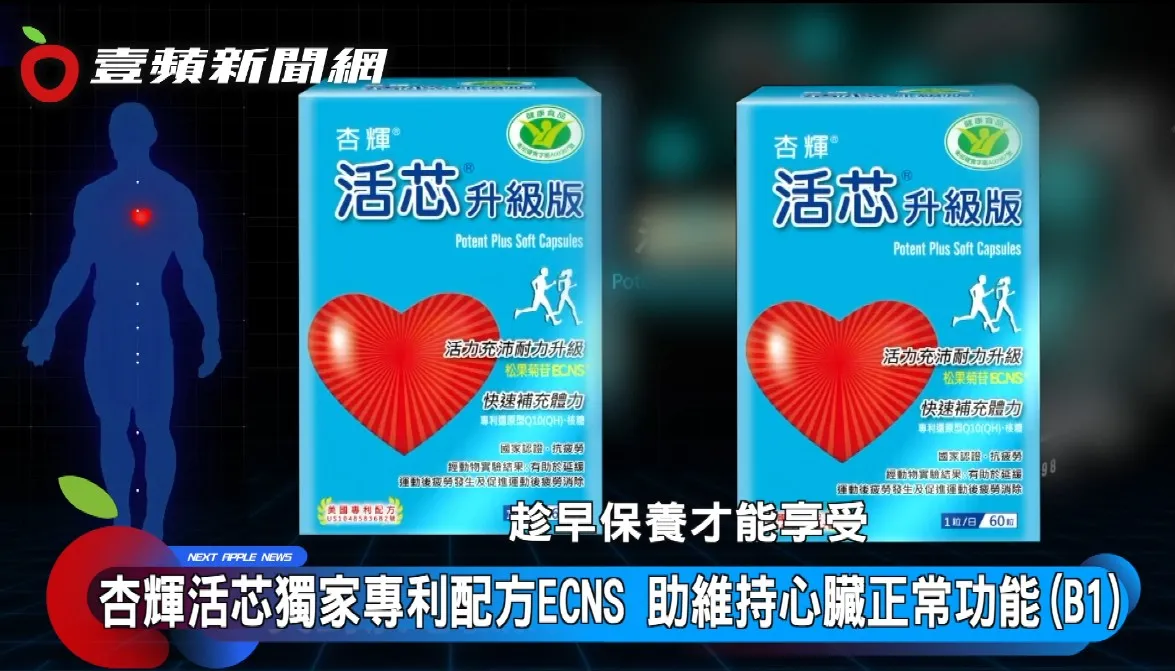 「杏輝活芯升級版」除了有還原型Q10 (QH) 之外,也額外添加獨家專利成分ECNS(松果菊苷)及B1,有助於維持心臟正常功能。實驗證明可提升2倍以上的體耐力、消除運動後疲勞,且效果比單獨還原型Q10 (QH) 表現更好,複方配方帶來雙重保健支持。