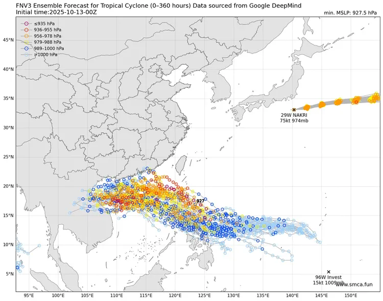 隨著東北季風即將南下、熱帶擾動發展迅速,氣象專家警告,未來幾天將是觀察是否形成「秋颱共伴效應」的關鍵期。氣象達人吳聖宇指出,目前在關島南方低緯度海面上有東風波擾動96W存在,未來5至7天將順著強勢的太平洋高壓往西移動,預估將朝菲律賓以東海域前進,週五至週末(17至19日)有機會逐漸接近、通過菲律賓呂宋島後進入南海,並可能發展為熱帶性低氣壓或輕度颱風。