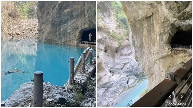 林保署昨公布燕子口步道現場畫面,水面直逼路面。《壹蘋新聞網》記者實際查看Google Maps於2021年所攝畫面,該路段溪水水位原本和馬路高度還有一段很大差距,對照林保署公布的照片,明顯可見水位急升。